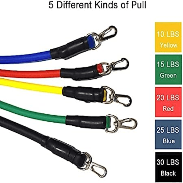 - five color adjustable resistant bands, black 50pound, blue 40pound, red 30pound green, 20lb, yellow 10pound. equivalent combination.