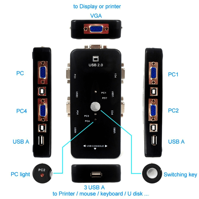 - this high quality 4 port usb kvm switch lets you control 4 usb-enabled computers using a single keyboard, mouse and vga monitor