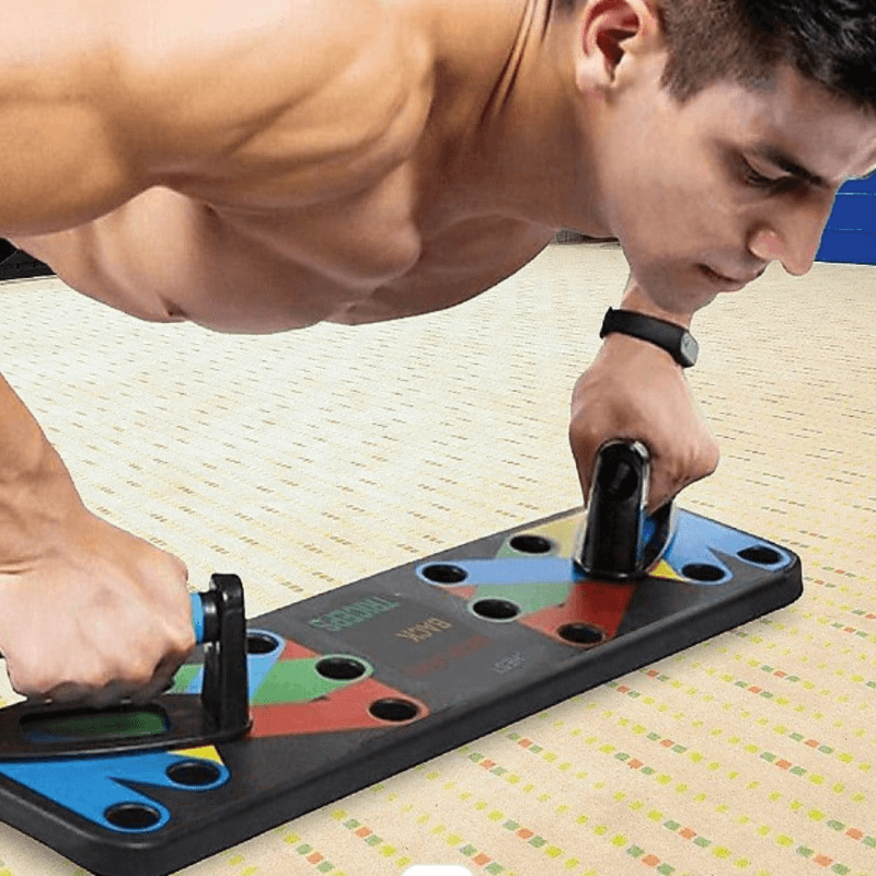 - colour-coded board to target specific muscle groups: blue for chest muscles, red for shoulder workouts, yellow for your back, and green for triceps exercises