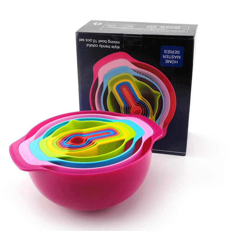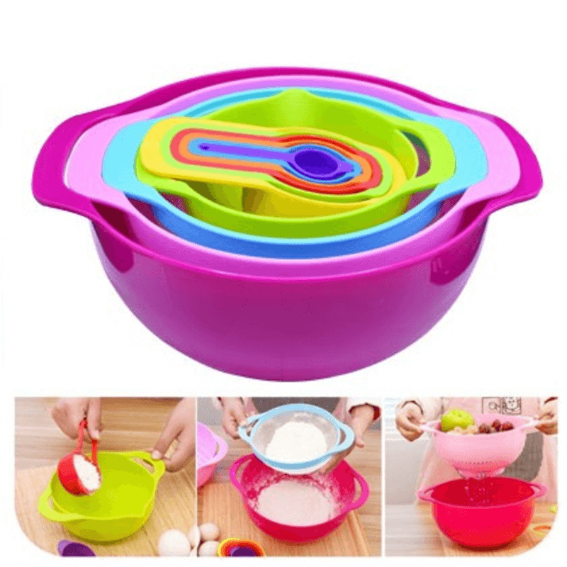 - rainbow bowl set consist of 10 sets (size mixing bowl, filter bowl, plastic sieve, measuring spoon)