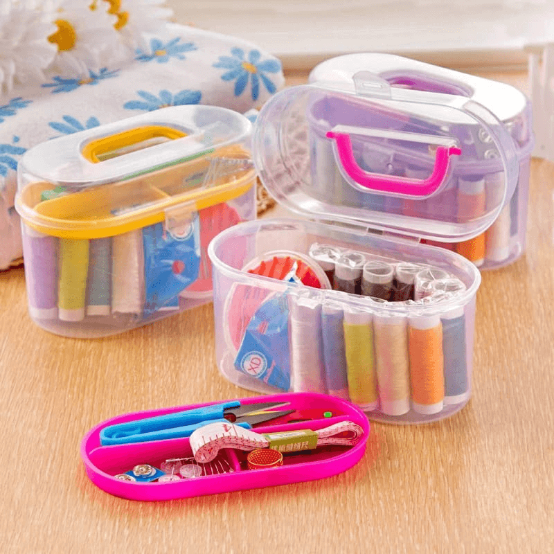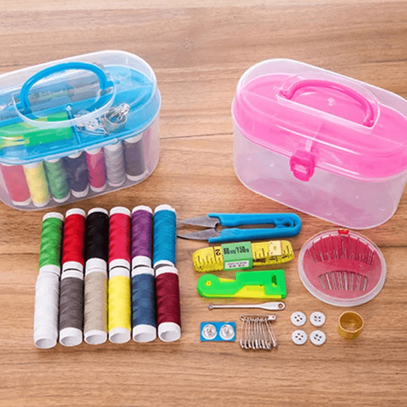 - comes with 5 storage bins, 10 threads, 16 sewing needles, measuring tape, 10 safety pins, 2 buttons