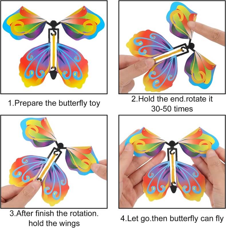 - Easy to use-Hold the butterfly's tail still and rotate the butterfly head about 25 times to make the rubber band rotate tightly and then loosen. Once loosened, it will fly to the sky